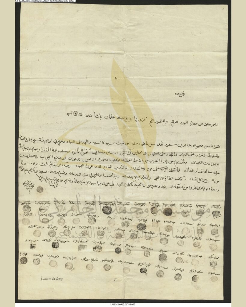 وثيقة عثمانية سنة 1258هجري موافق1843ميلادي الرسالة مرفوعة إلى والي جدة( عثمان باشا)،وفيها شكوى من ظلم خالد بن سعود، لسوء سيرته والتجبر والظلم في الأموال والأنفس، وارتكاب الفساد، وتسليط الأشرار، وتعطيل الفرائض، وتعاطي المحرمات، وسلب أموال الفقراء، وموالاة النصارى، مما أدى إلى كراهية الناس له ودعائهم عليه. ويطلب كاتب الرسالة التدخل لرفع الظلم، وإنقاذ العباد، وحماية الأمة الإسلامية من أفعاله، ويرجو من الوالي المساعدة والنصرة. * • عبدالله ثنيان السعود • علي بن خميس • تركي النجراني • عبدالعزيز بن عبدالجبار • زيد بن هلال • عبدالله الوهيبي • عمر بن ظريف • احمد بن مشرف • منصور بن محمد • عبدالله أبابطين • ابراهيم بن عبدالله • عبدالله بن عبداللطيف بن نعيم • فواز بن محمد • ضمان بن ناصر • مهند بن عفيصان • ابراهيم بن عبيد • محمد بن حسين • محمد بن مقرن • علي بن غانم • ابراهيم بن سيف • عبد الرحمن بن مانع • عبد الرحمن بن حسين • سعدون بن سيف • علي بن حسين • موسى الحملي • عبد الرحمن بن حسن • عمر بن عفيصان • سيف بن عفنان • حمد آل مبارك • جاسر بن فريان • عبدالعزيز بن عياف • ابراهيم بن رواف • عبدالله آل ناصر • دخيل الله بن شرف • سعد بن محمد • عبدالرحمن بن عبيكات • راشد بن جفران • مبارك بن محمد • سليمان بن محمد • مهدي بن طميهير • حمد بن عياف • ابراهيم بن سلطان • صالح بن راشد • ناصر بن جبرين • يوسف بن عمران • علي بن عبدالله • سعود بن قرصان • محمد البواردي • محمد بن حمد • عبدالعزيز القنقري • سعود بن عياف • محمد بن سالم • محمد بن هادي • فيصل بن محيان • شافي بن شعبان • فلاح بن حثلين • قياس بن غضيب • سلطان بن ربيعان • فهيد الصيفي • عساف أبو ثنية • محمد الدويش • منصر بن نافع • سعد المطيري